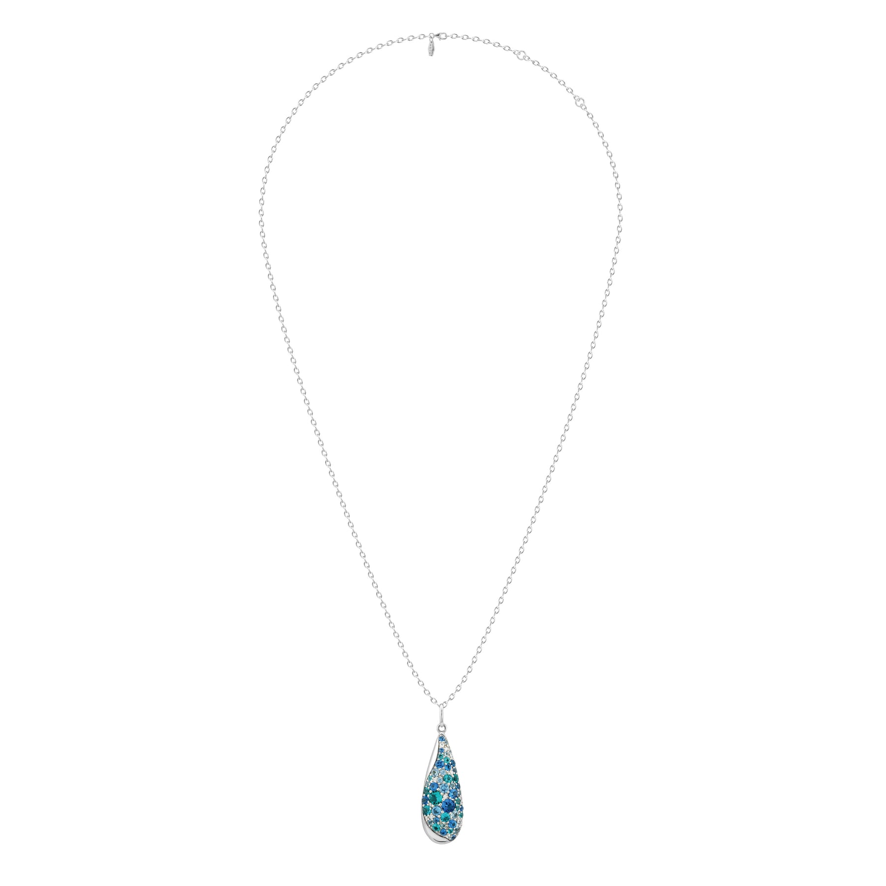 A sleek silver contour sweeps gracefully around the pendant, cradling a vivid, organically scattered formation of round crushed ice-cut ARTĒ Gems ??their richly layered, multi-tonal brilliance evoking the shifting depths of nature. Sculptural yet wearable, this elongated teardrop pendant is effortlessly modern and distinctly refined.