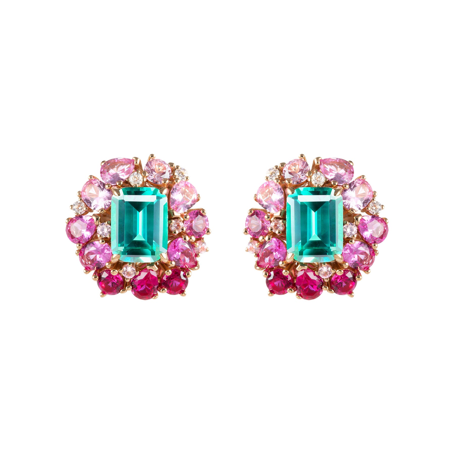 Inspired by the whimsical charm of classical ballet The Nutcracker, these stud earrings each feature a mesmerizing emerald-cut sapphire in a stunning greenish-blue hue, beautifully surrounded by a cluster-halo of mixed-cut pink sapphires ingradient shades. Meticulously handcrafted, each piece showcases a harmoniousblend of vibrant colours, reminiscent of the magic and wonder of the holiday season.