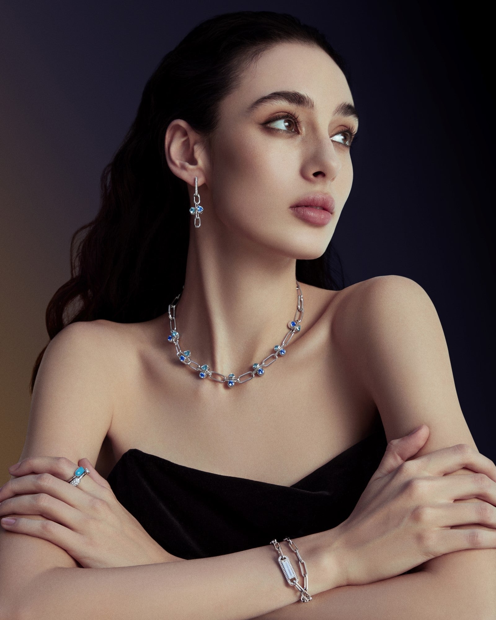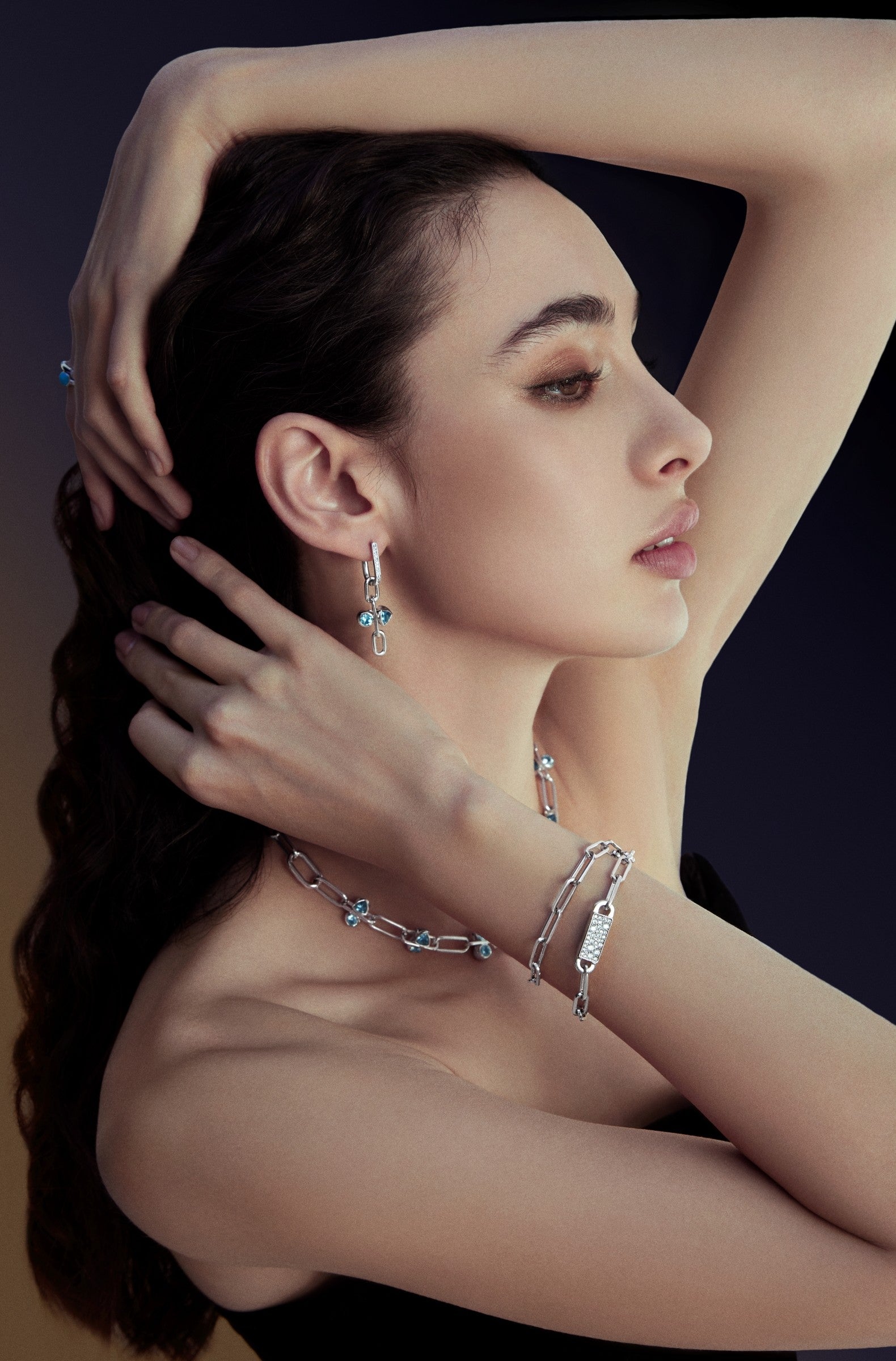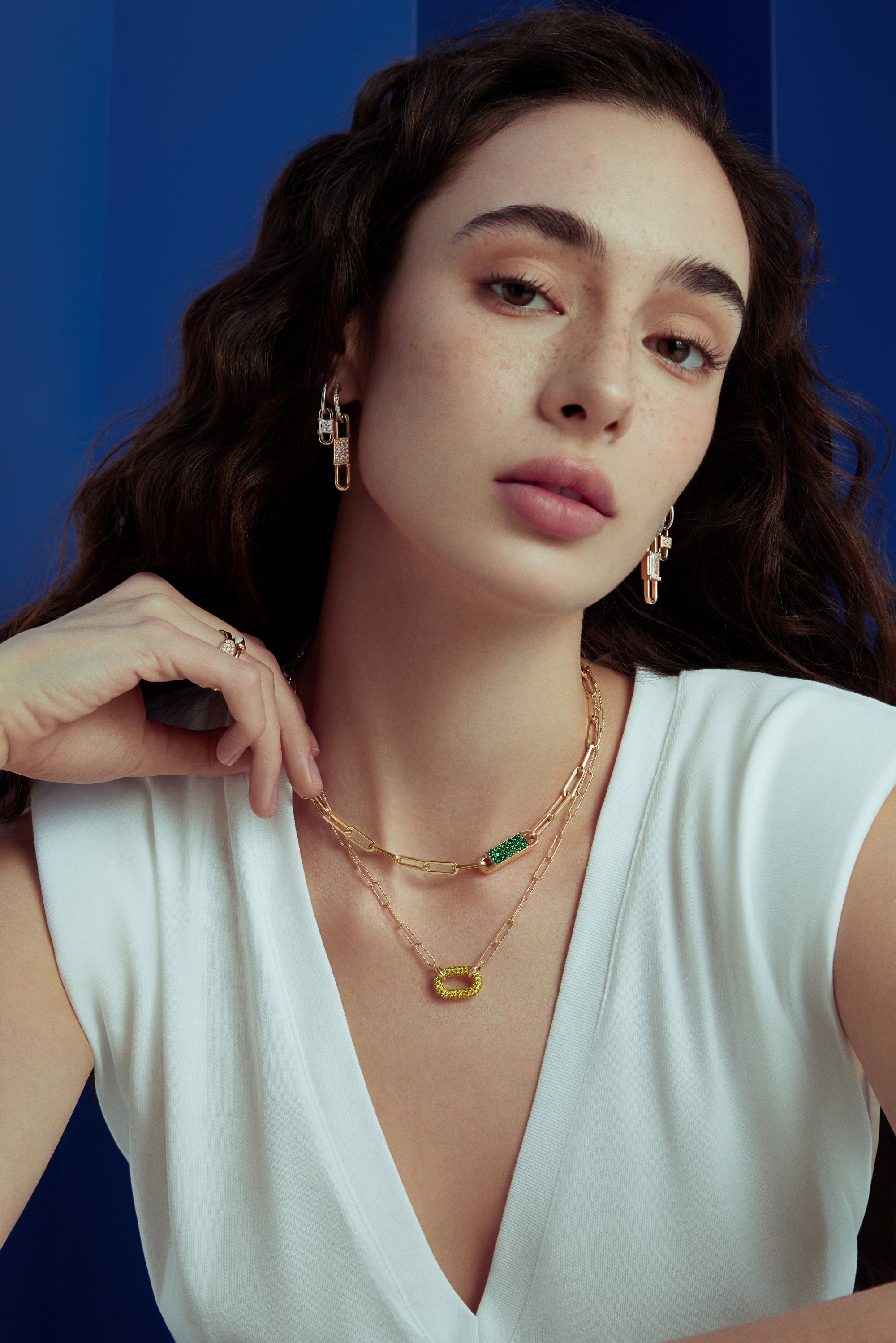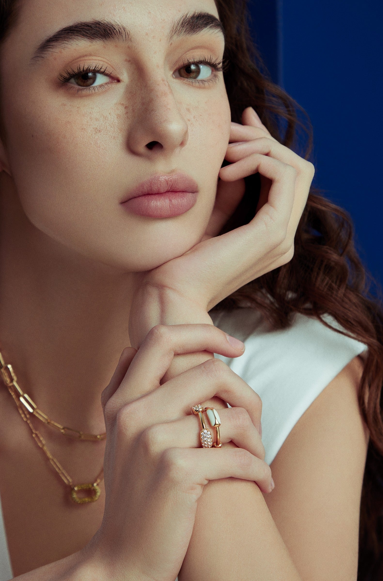 Featuring a captivating juxtaposition of oval links and sleek sculptural lines, the collection effortlessly blends style and glamour, inviting endless styling possibilities while defining a multidimensional aesthetic for everyone.