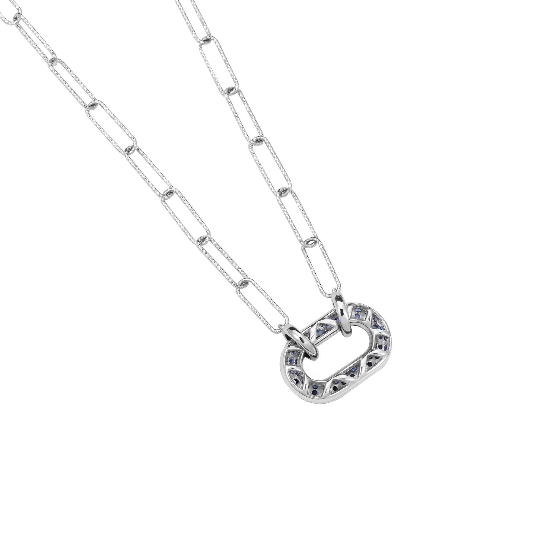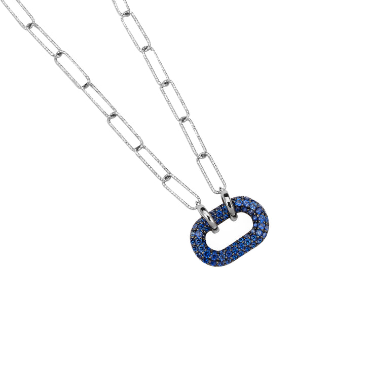 Delicate oval link necklace featuring a puffy oval link fully paved with ARTĒ Gems in Sapphire Blue. The chain body showcases diamond cut finish for an extra shiny flair.