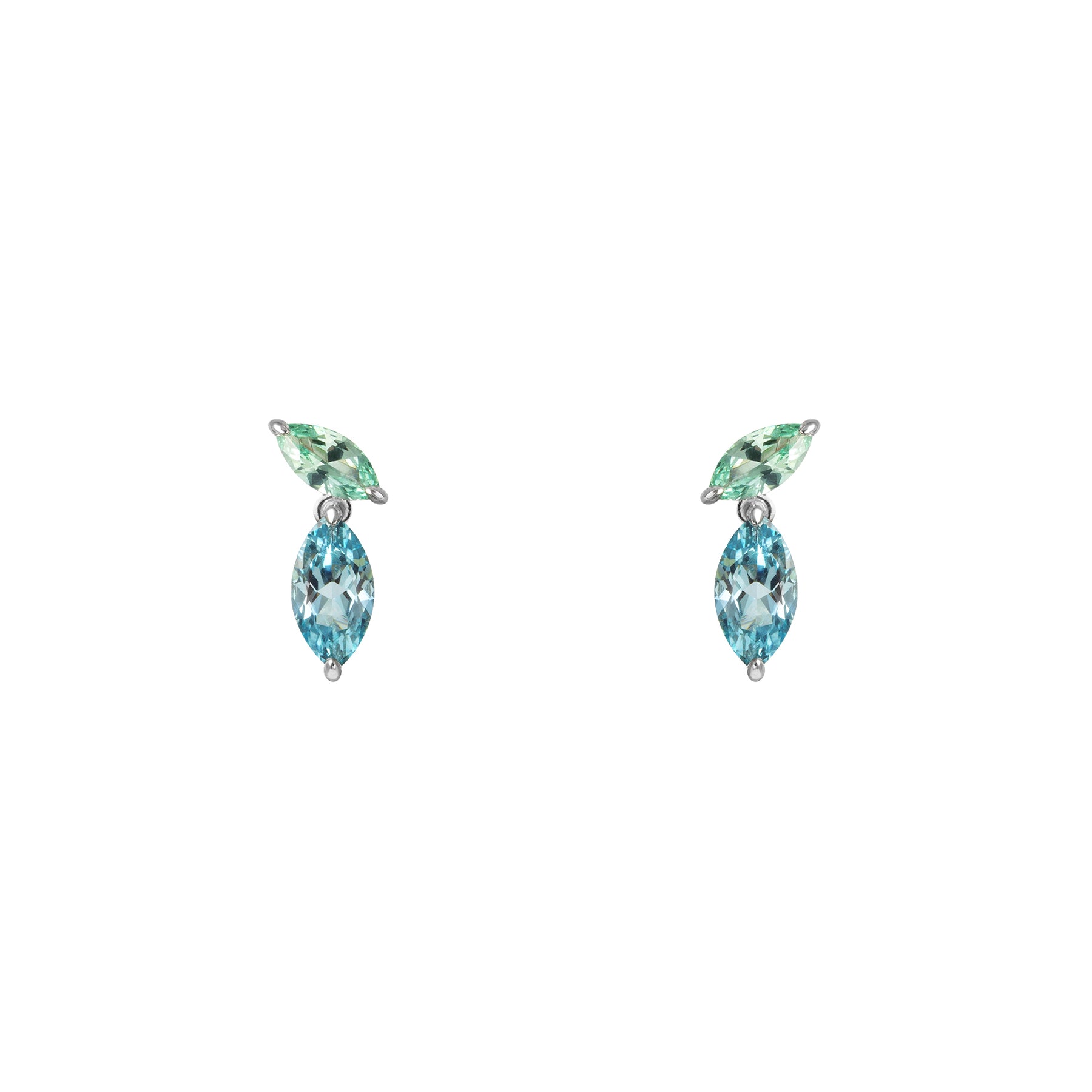 ARTĒ Lab Gem drop earrings each featuring 2 connecting marquise-cut gem in Seafoam Green and Bright Teal Blue, exuding understated elegance.