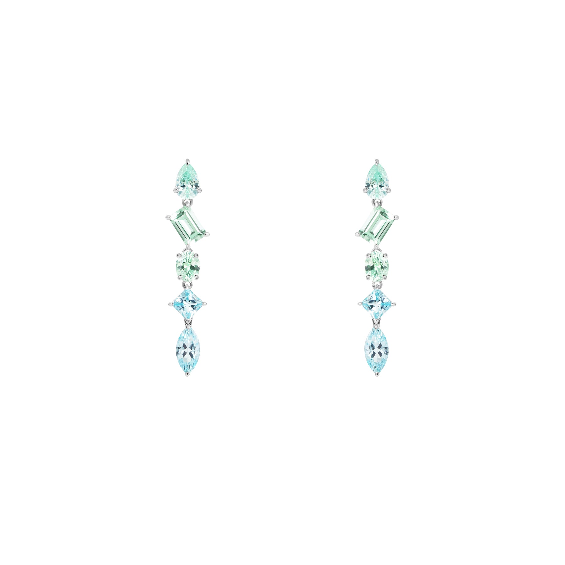 ARTĒ Lab Gem dangle earrings each showcases 5 beautifully cut gemstones, smoothly transitioning from Seafoam Green to Aqua Blue hues. This design evokes a refreshing summer breeze, offering an ethereal touch and a chilling summer vibe enhanced by the soft ombre effect.