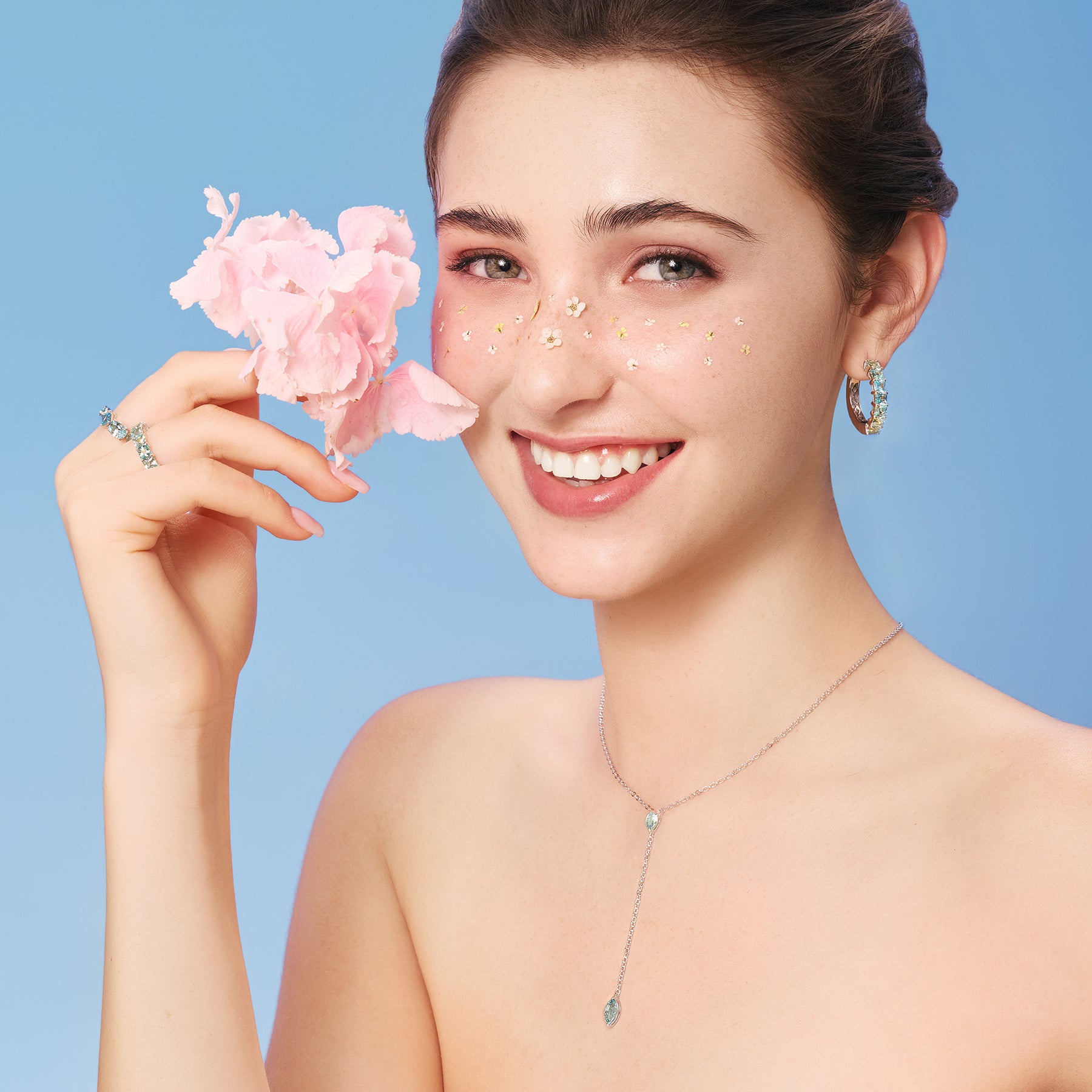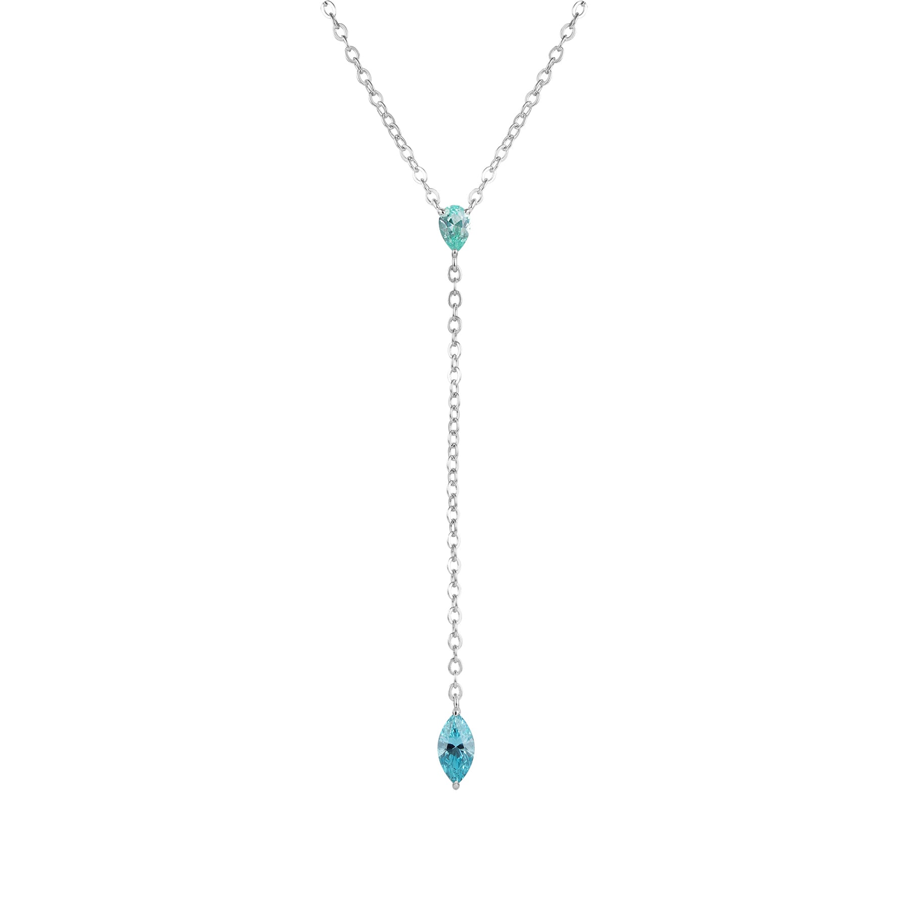 ARTĒ Lab Gem Y-drop necklace featuring a center pear-cut gem in Seafoam Green, linked by a delicate chain that gracefully suspends a stunning marquise-cut gem in Bright Teal Blue, exuding understated elegance.