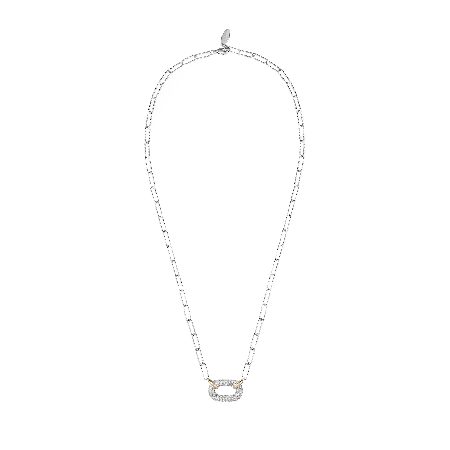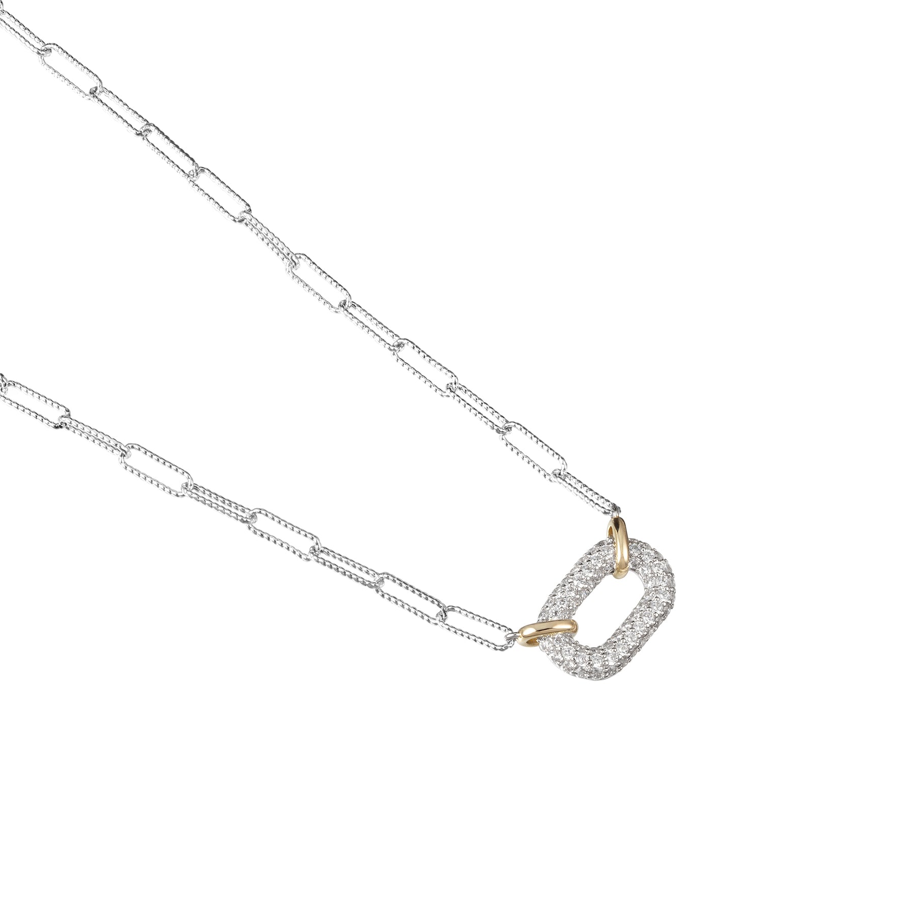 Delicate oval link necklace featuring a fully paved puffy oval link with contrasting gold-toned bails. The chain body showcases diamond cut finish for an extra shiny flair.