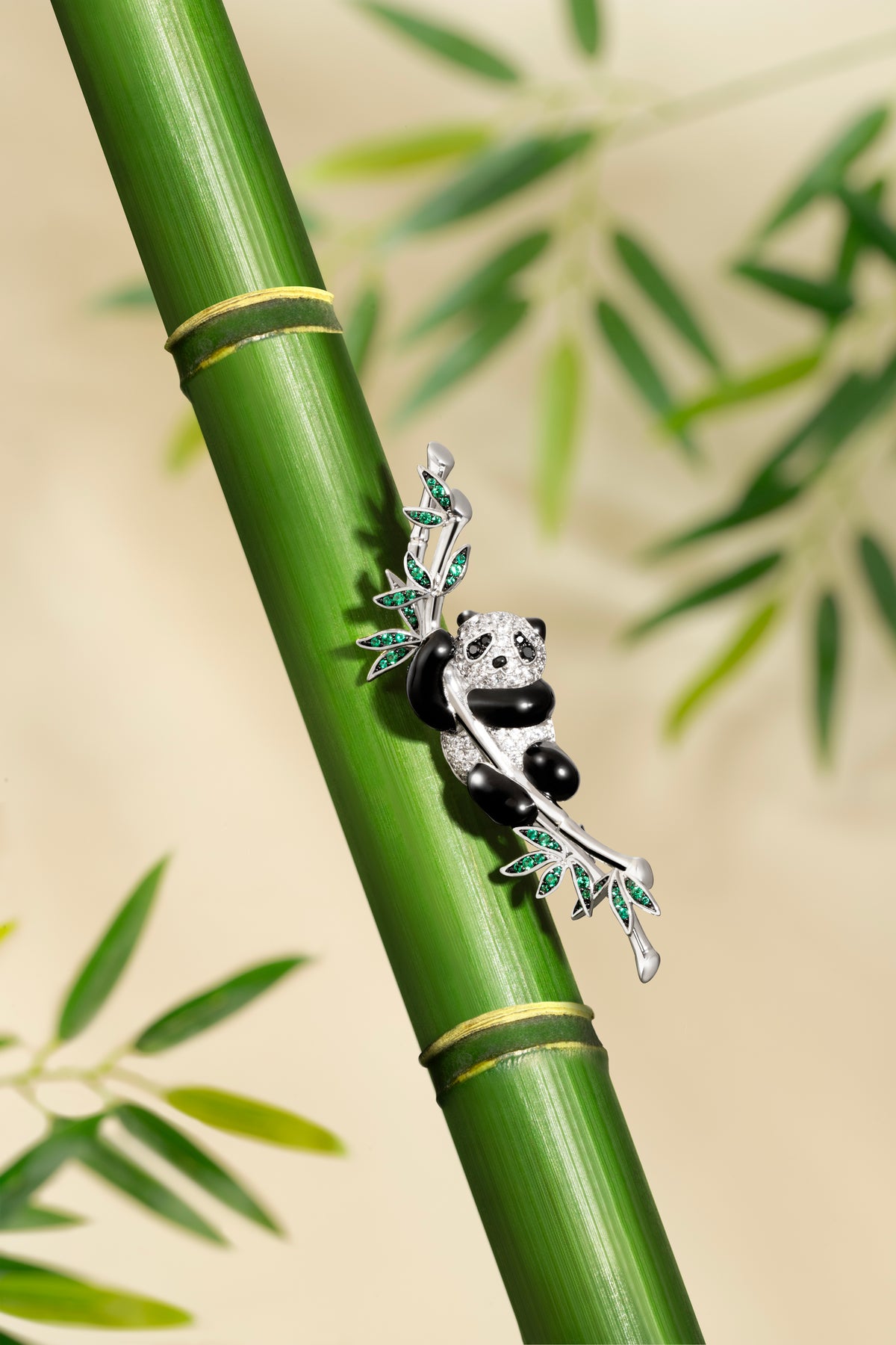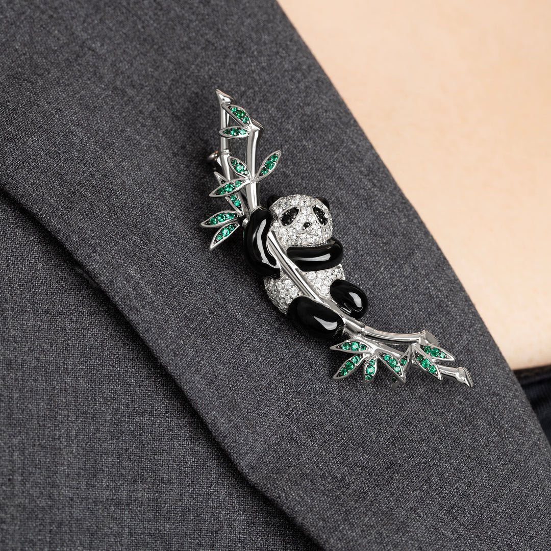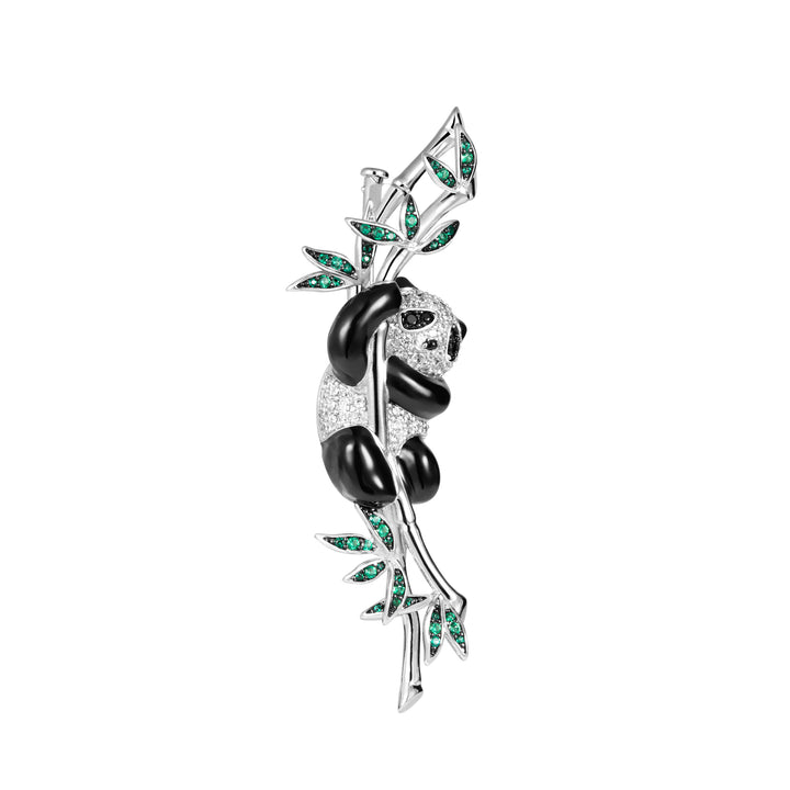 Semi-stereo panda brooch featuring a playful panda adorned with black and white ARTĒ gems, adorably hanging from a bamboo branch encrusted with vibrant green ARTĒ gems that represent verdant bamboo leaves.