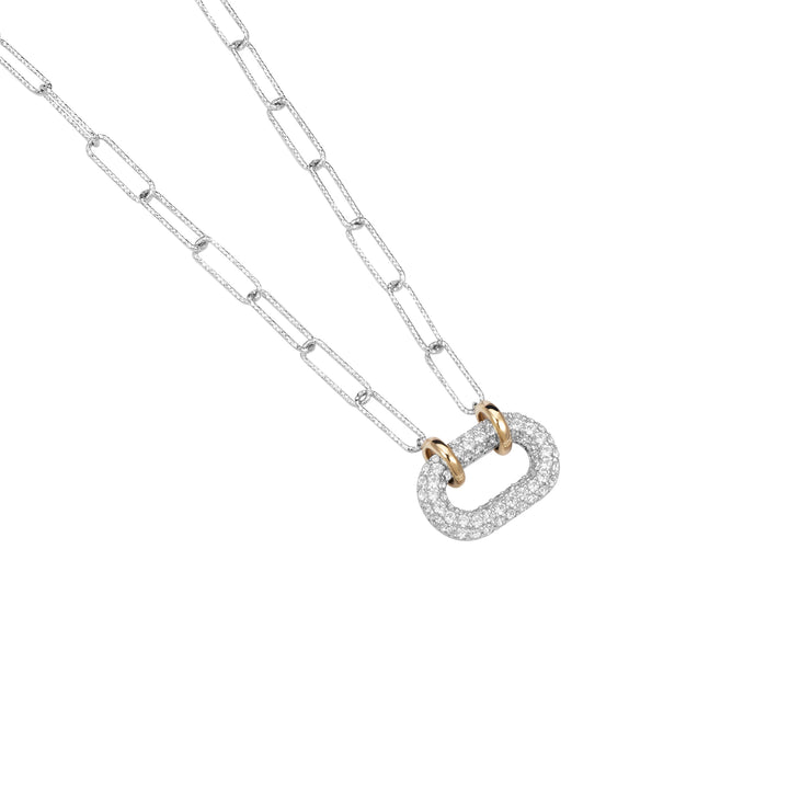 Delicate oval link necklace featuring a fully paved puffy oval link with contrasting gold-toned bails. The chain body showcases diamond cut finish for an extra shiny flair.