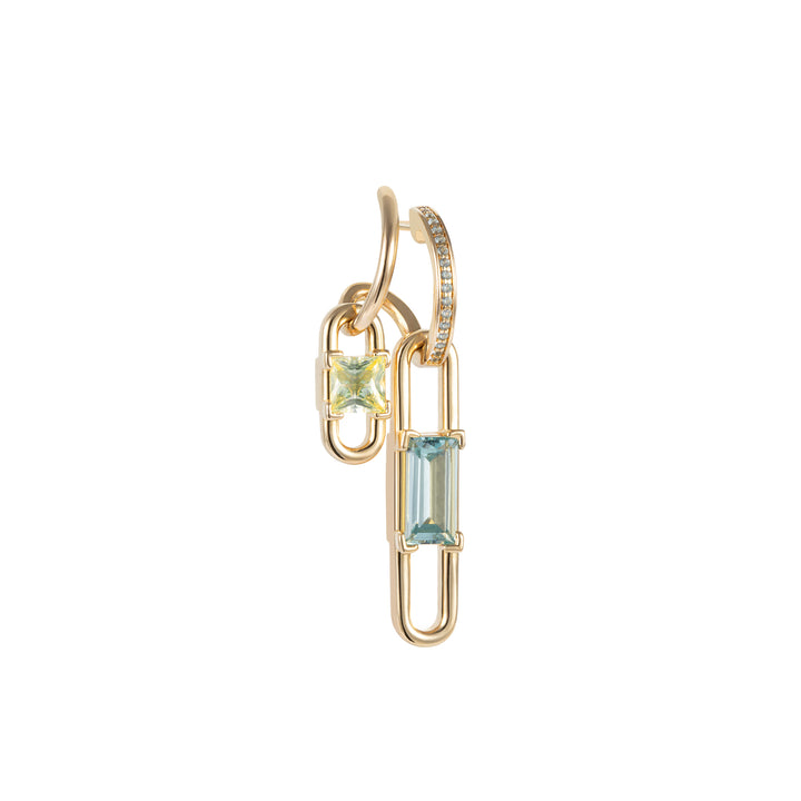 Convertible double hoop earrings featuring four reversible drop charms in two sizes for mix-and-match styling. Each toggle-inspired drop charm comes with a baguette-cut or square-cut main stone, either in Paraiba Blue or Canary Yellow, while the flip side features a bed of melee gems in Olive Yellow or Emerald Green for a contrasting brilliance.