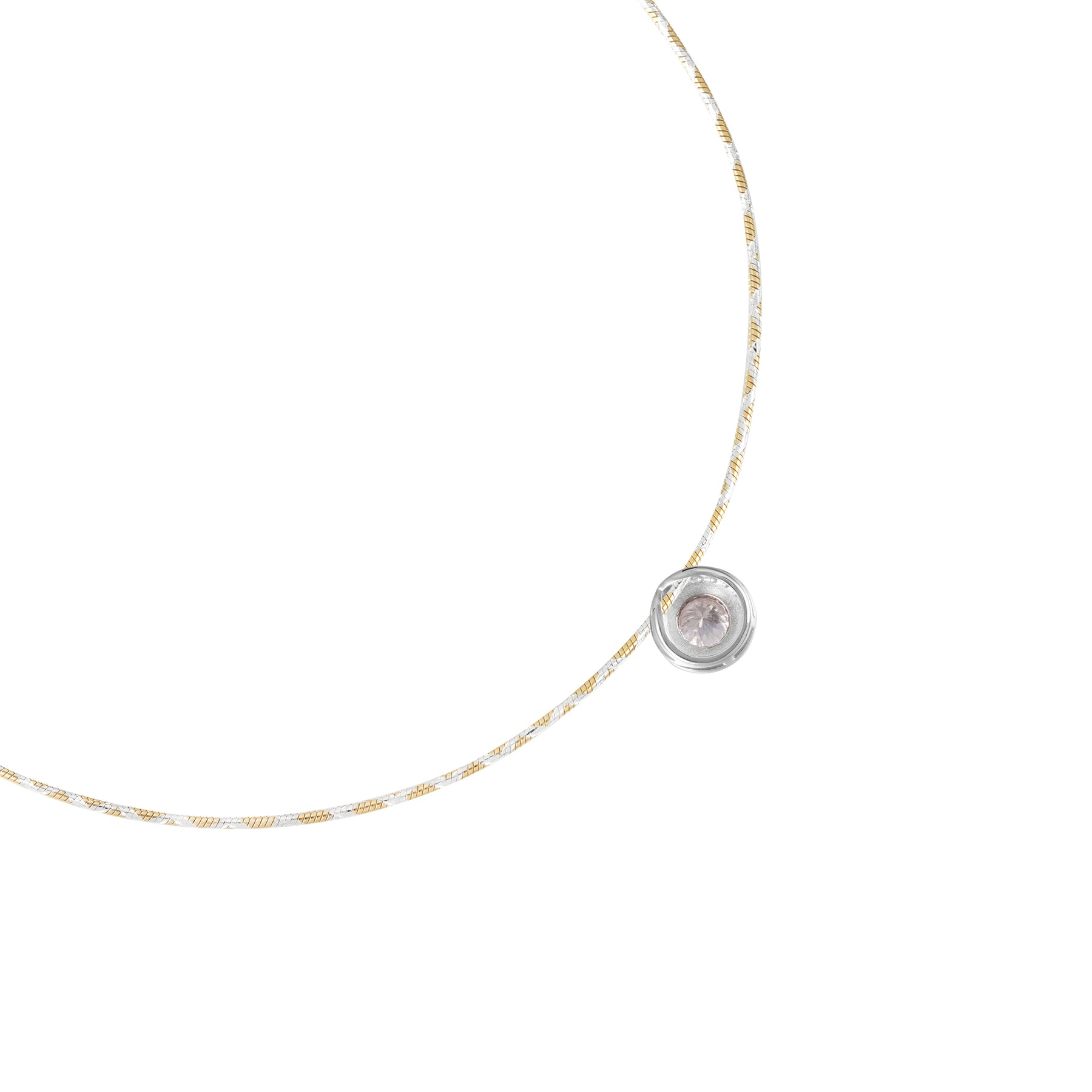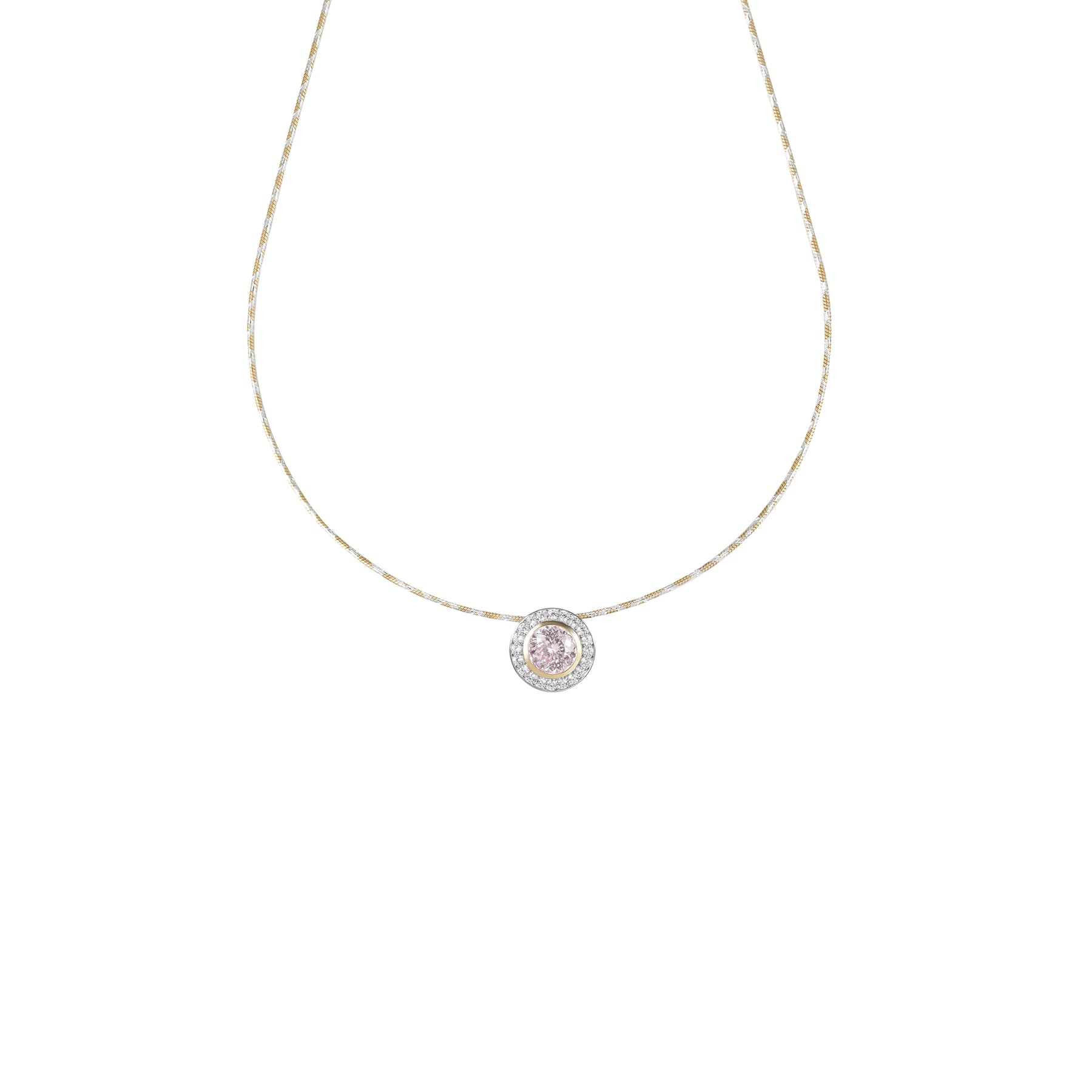 Two-toned ARTĒ Gem Pendant features a bezel-set, round-cut center stone in Fancy Pink, surrounded by a halo of gems in white.