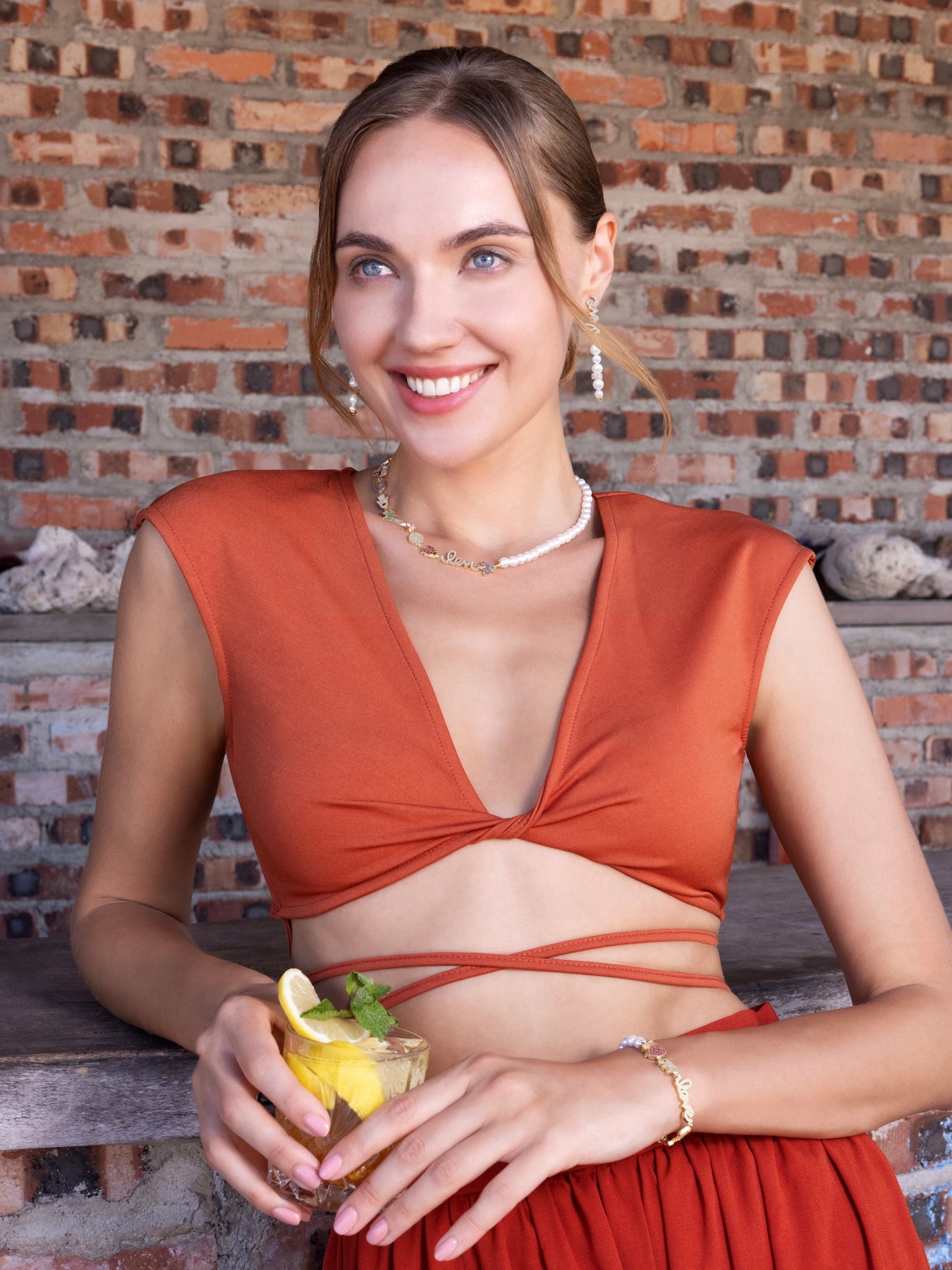 Melee ARTĒ Gem-paved love script dangle earrings adorned with swaying pearls and gem roundels.