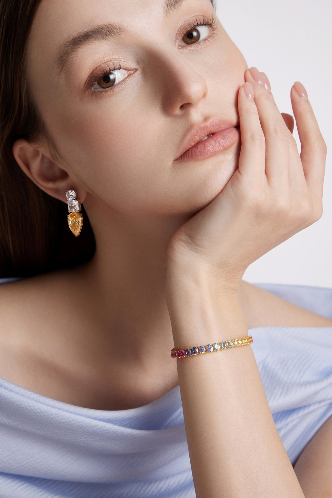 ARTĒ Stone dangle earrings, each featuring a round-cut and princess-cut gems in white, and an enchanting reversed pear-cut gem in Citrine Yellow at the bottom.